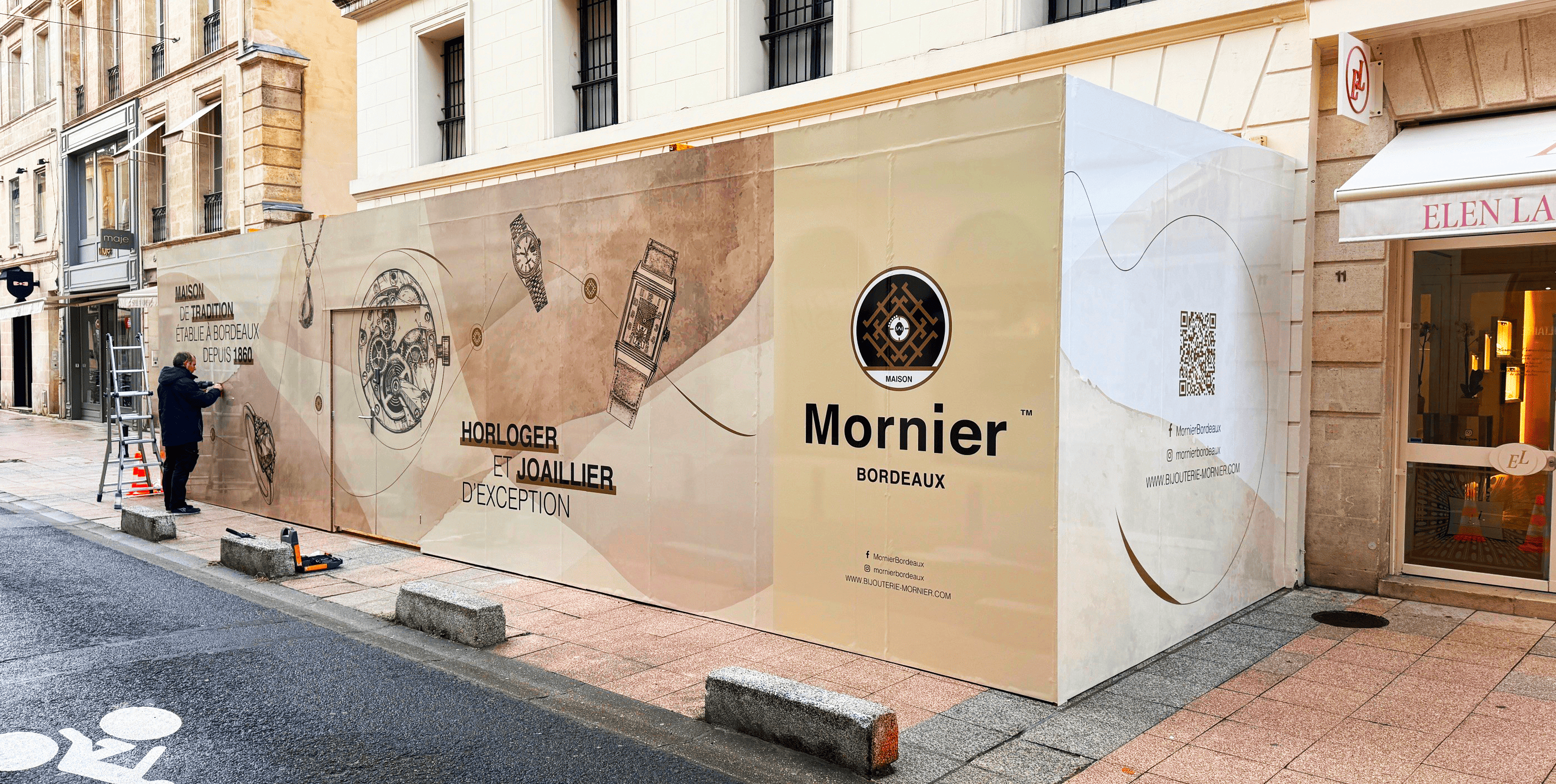 Création d'un habillage de palissade annonçant l'ouverture d'une nouvelle boutique pour Maison Mornier, horloger et joaillier de luxe bordelaise.
