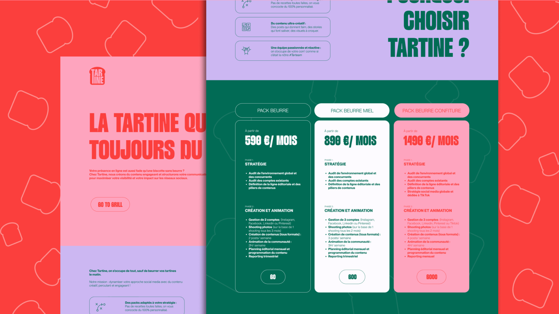 Création de l'identié visuelle et du site internet Tartine. Une agence social media bordelaise spécialisée dans la food.